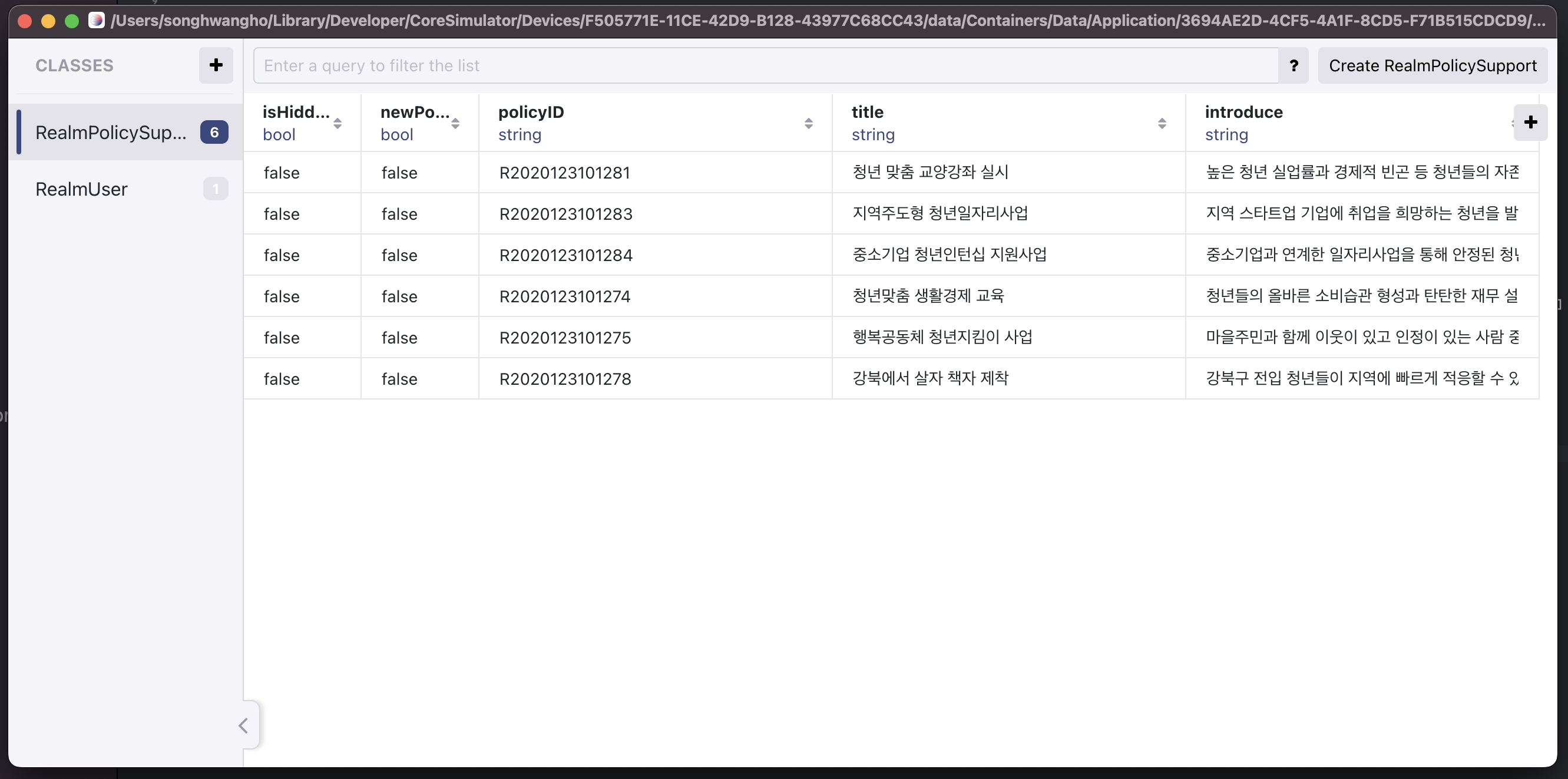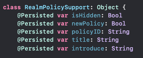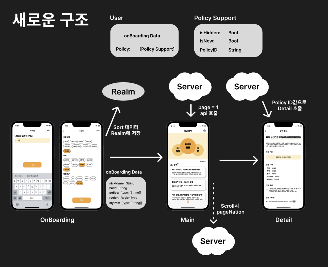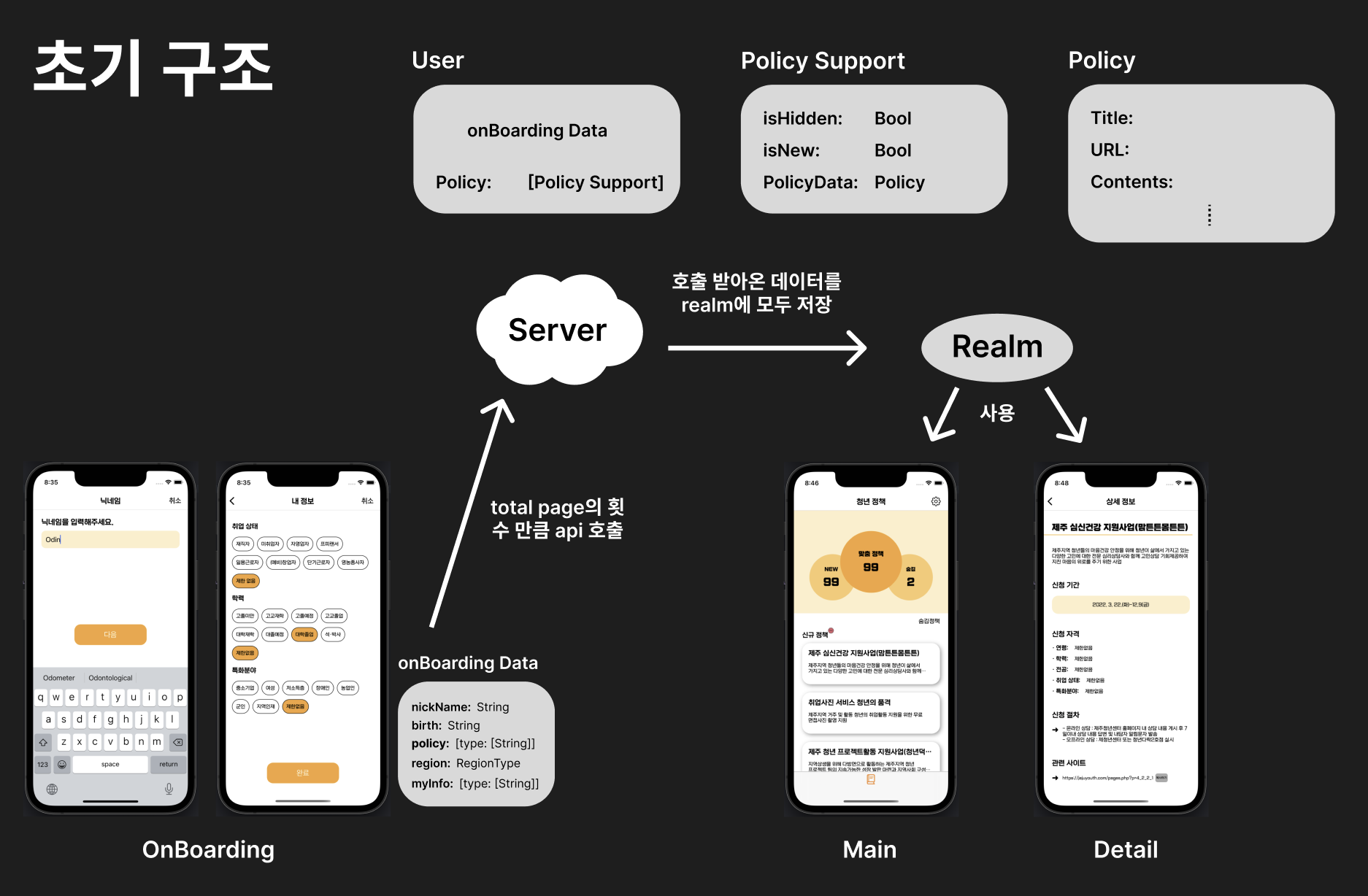 또한 realm에 정책, 내용, url, 지원 절차 등의 모든 데이터를 저장하고 새부 화면에서 띄워주는 방식에서