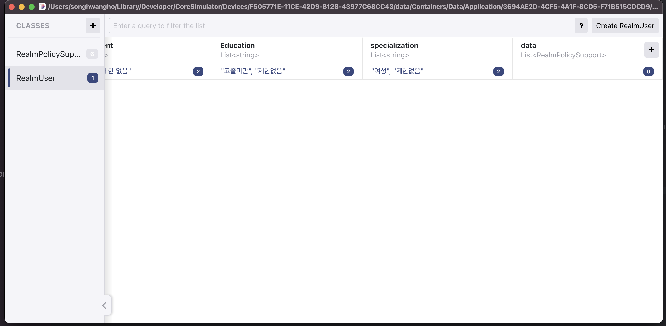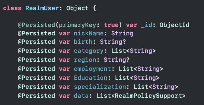 데이터 구조를 보면 알 수 있듯이 RealmUser라는 데이터 내부에 RealmPolicySupport라는 구조체의 List 값을 갖는 변수가 존재합니다.