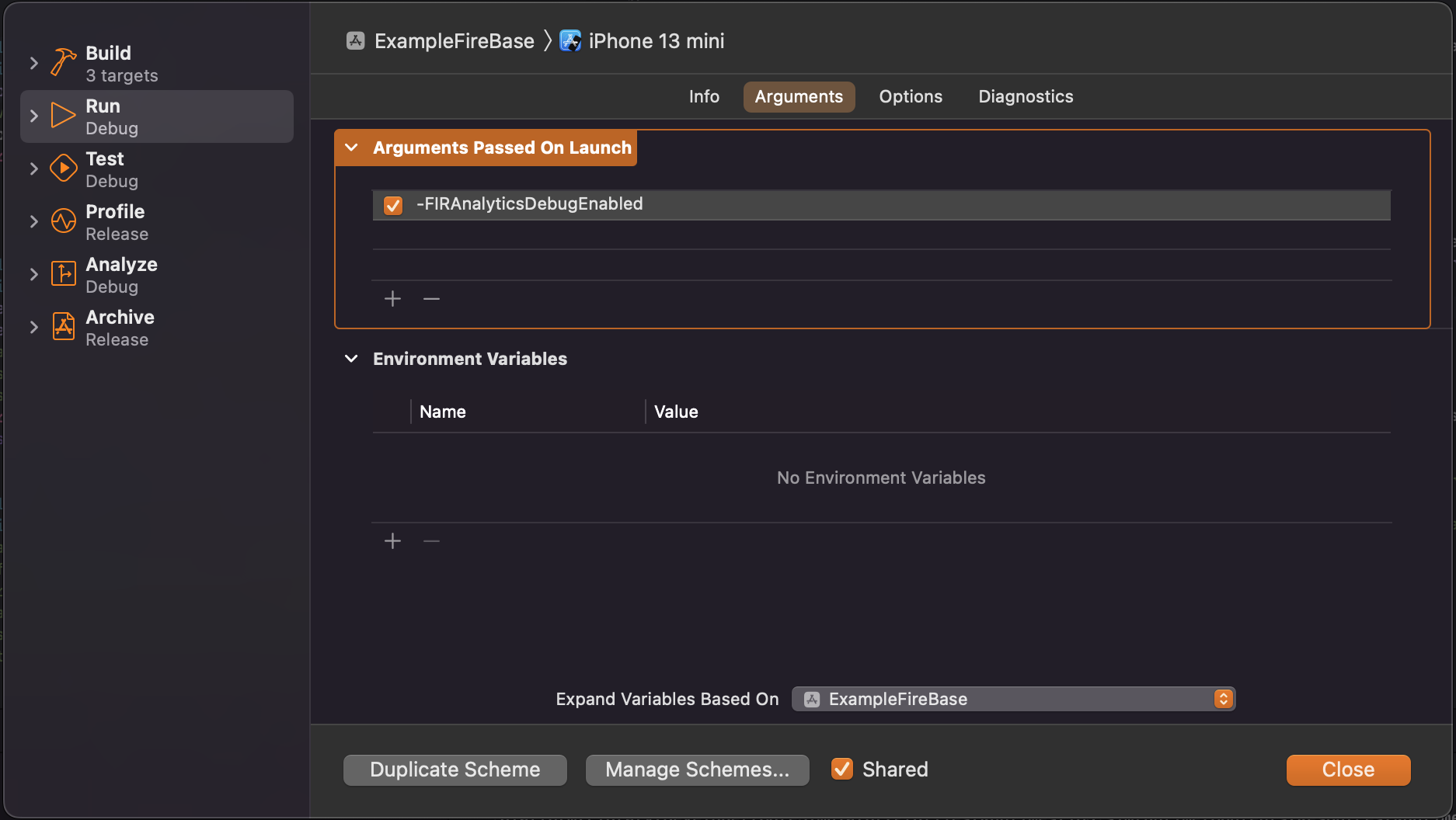 - Firebase 콘솔 안에서 데이터를 확인하는 부분인 DebugView는 (사용자 기기의 배터리 절약, 네트워크 데이터 사용량을 줄이기 위하여) 약 1시간동안 앱에서 취합된 후 일괄 업로드하지만, Arguments를 추가할 경우 지연 시간을 최소화하여 분석에 집중 가능합니다.